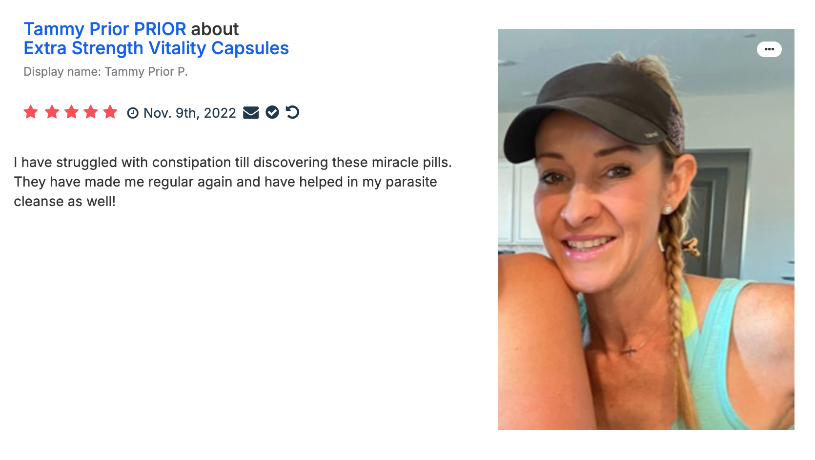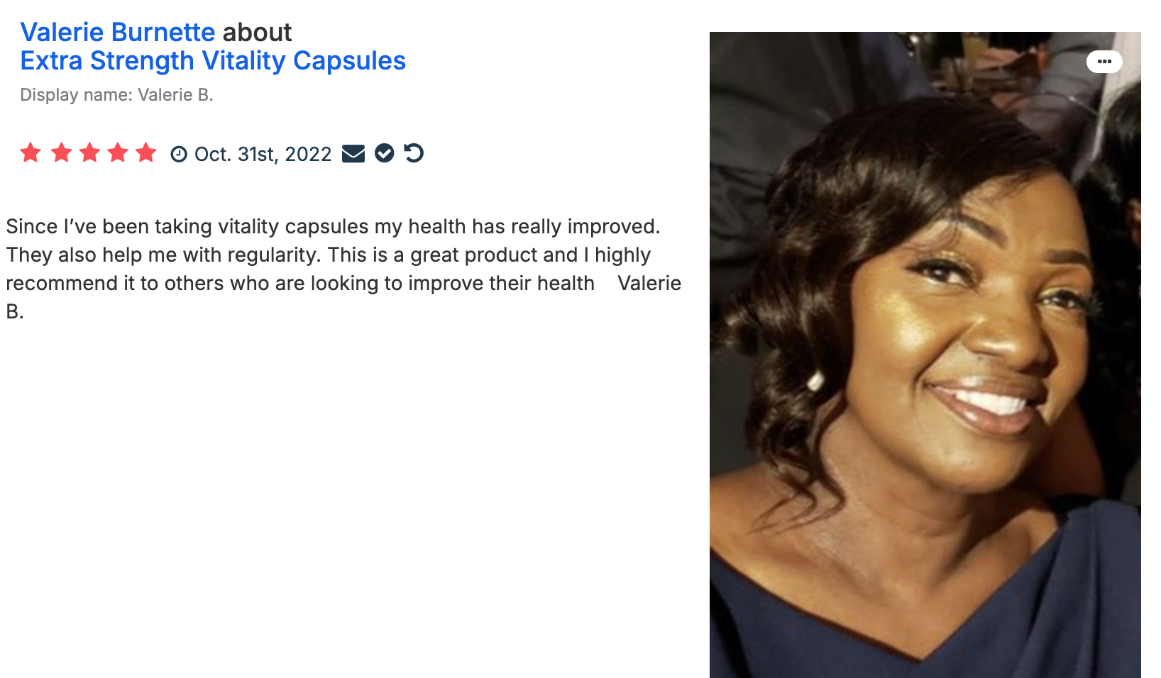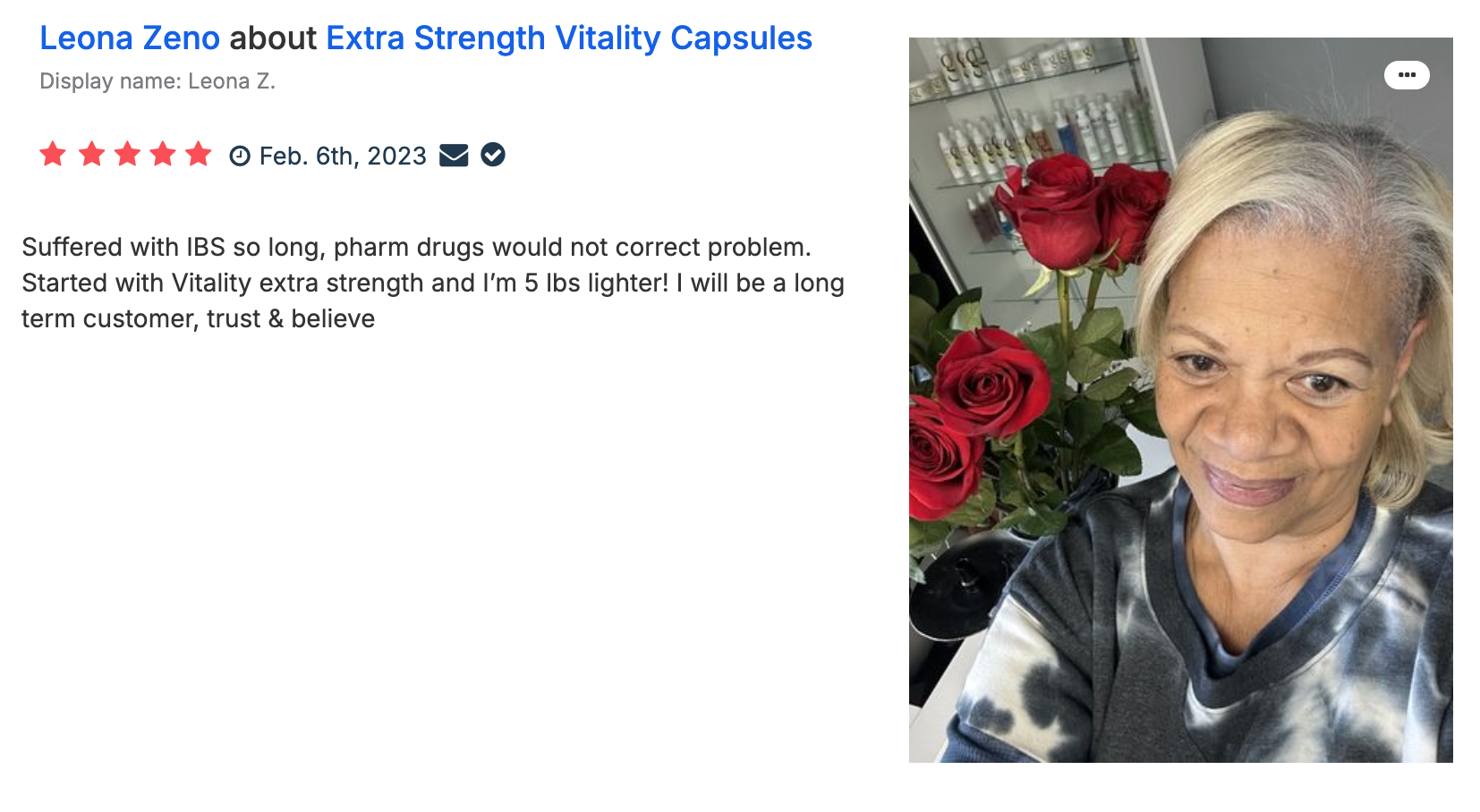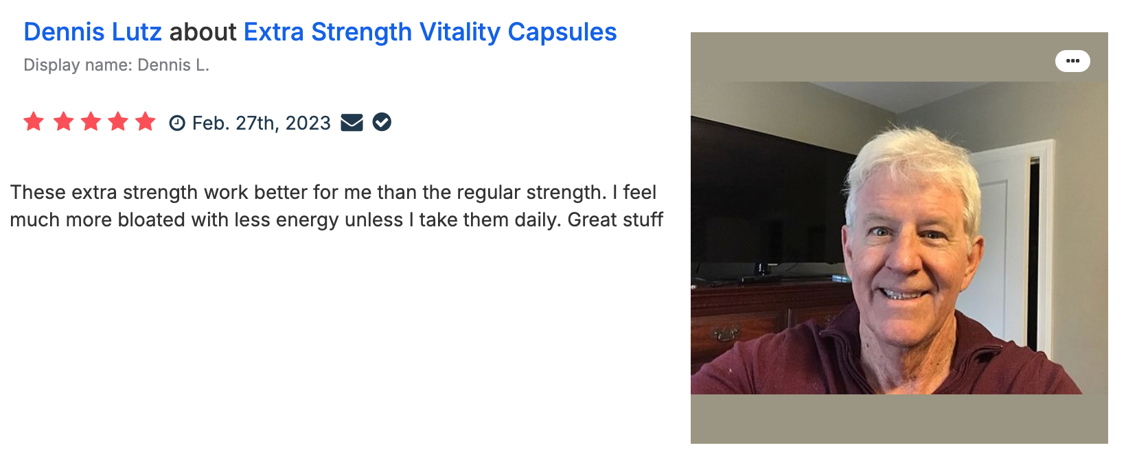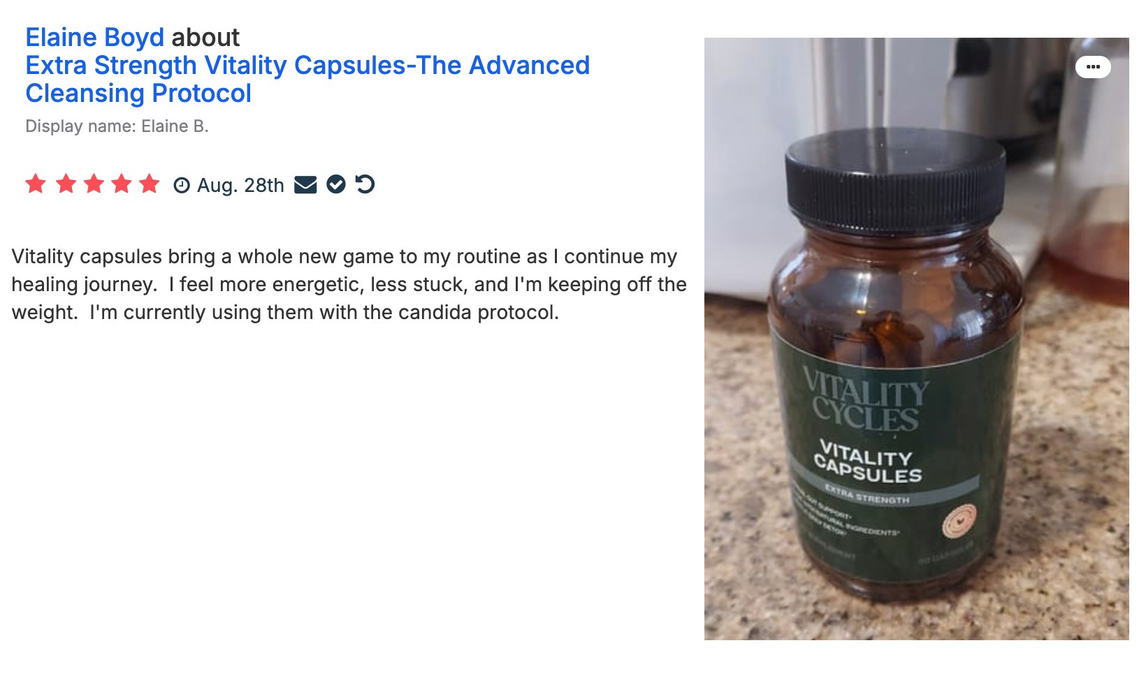 “I cant imagine my life without vitality capsules! Game changer! I feel so much better and stronger and more lively! Thank you so much for creating this genius product !!!!”